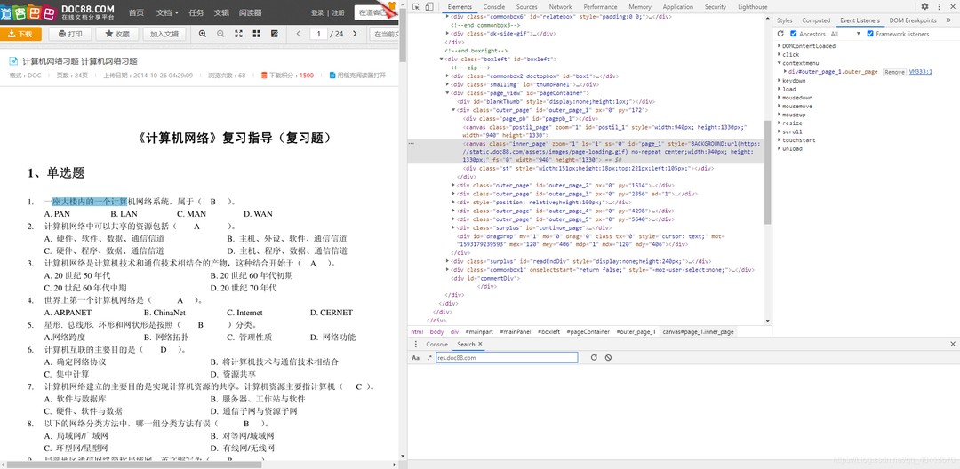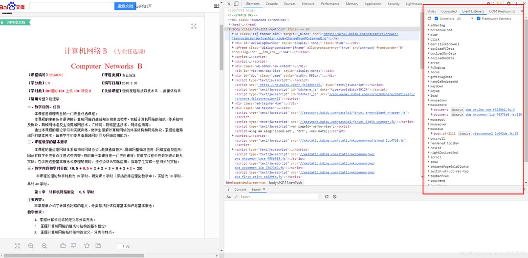 在某度文库中直接右击检查元素的话,是能够直接看到文字的,可以直接在调试面板的Elements审查元素中复制,但是总是有些麻烦。如果在选中某度文库的东西会弹出他自行插入的复制按钮,无论是按Ctrl+C或者点击他的复制按钮都无效,除非开通一个VIP,本着白嫖的原则,且文本都下载到浏览器了还不让复制有点说不过去,于是首先研究一下他的Event Listeners。