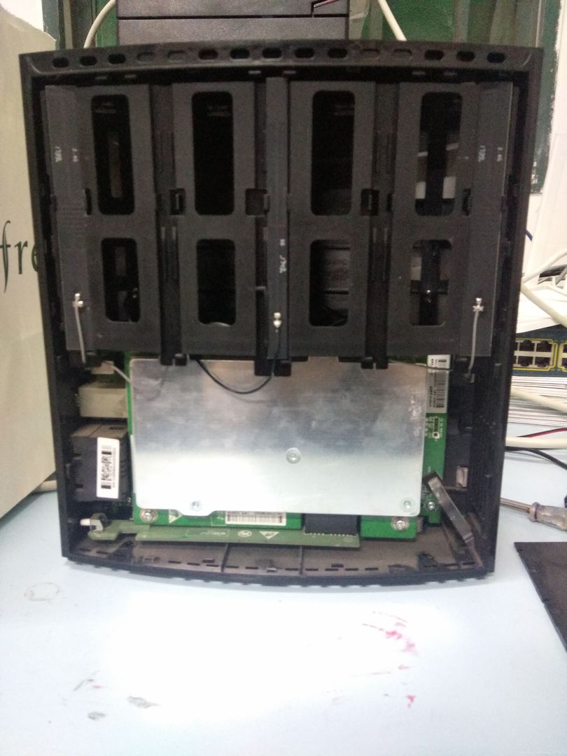 首先我们要把K3C的外壳拆掉,路由器的下边脚垫揭下来后有四个螺丝,只需要卸下来背面的俩螺丝就行了,背面就是没有interl喷漆的那一面,我在拆的时候掰断了好几个卡扣,这就比较尴尬,不过要无损地去拆也是比较难的,硬拆就完事了。