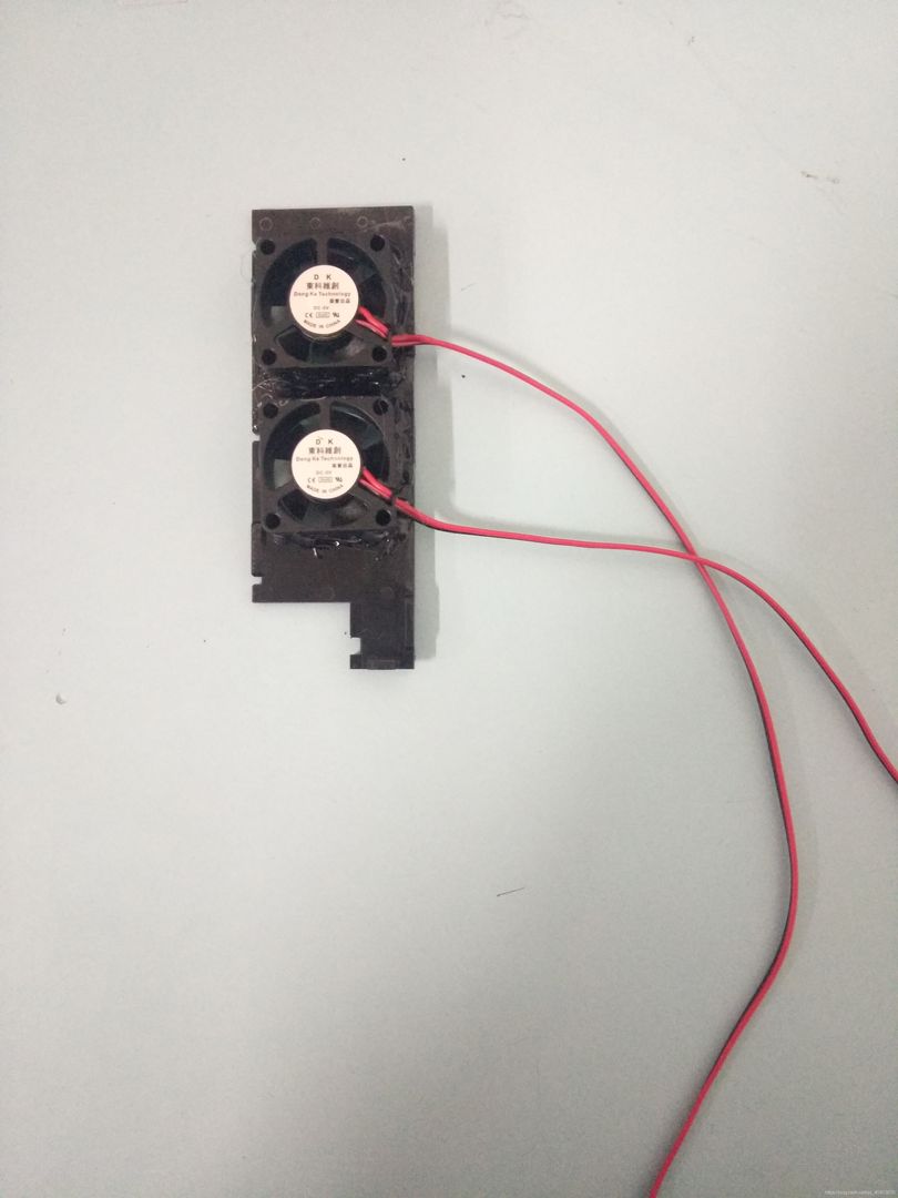 这个遮光片特别厚,在这上边扣俩洞可是废了我很大劲,用刀子割的话不太容易弄,我是用磨具硬生生磨出来了两个洞,在之后就是用胶枪把两个风扇沾到这个遮光片上,我是让他从外部向内吹风的,粘的时候别弄反了。